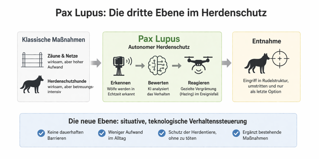 Im Fall Grindi Wolf Schwarzwald zeigt sich eine Lücke zwischen klassischem Herdenschutz und Entnahme. Systeme wie Pax Lupus bieten einen ereignisgesteuerten Ansatz, der Annäherungen erkennt und gezielt reagiert – ohne dauerhafte Barrieren oder Eingriffe in Rudelstrukturen.