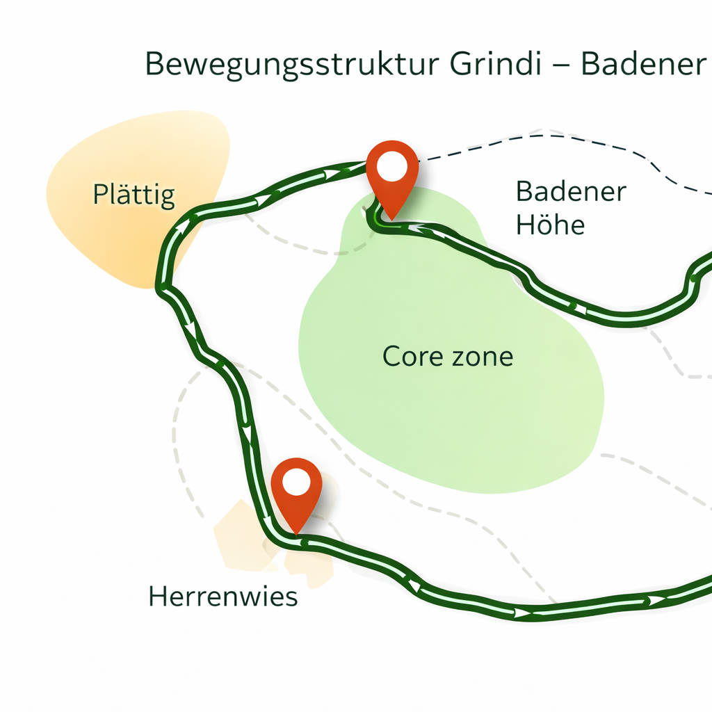 Grindi bewegt sich im Nordschwarzwald entlang weniger, durch das Gelände bestimmter Routen wie Badener Höhe und Herrenwies, nicht zufällig, sondern energieeffizient über wiederkehrende Wildwechsel und Übergänge.